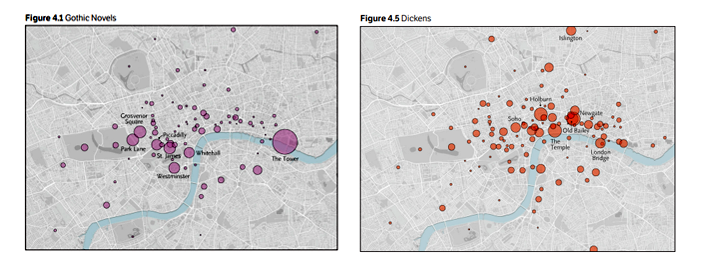 In de loop van de negentiende eeuw gebruikten Engelse romanschrijvers Londen en haar omgeving als emotioneel decor. Er voltrok zich een duidelijke verschuiving: van de duistere wereld van misdaad en straf in Gotische romans naar meer alledaagse locaties van moderne beroepen, bijvoorbeeld in romans van Charles Dickens. Bron: The Emotions of London (Stanford University), 2016.