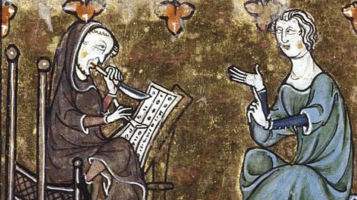 Afbeelding uit f. 137 van L’estoire del Saint Graal (ff. 1-76); L’estoire de Merlin (ff. 76-216). 1200-1400. British Library.
